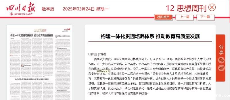 强国必先强教。今年全国两会政协联组会上,习近平总书记强调,强化教育对科技和人才的支撑作用,进一步形成人才辈出、人尽其才、才尽其用的生动局面。从教育大国到教育强国是系统性的跃升和质变,必须以改革创新为动力。党的二十届三中全会明确指出,深化教育综合改革,加快建设高质量教育体系。中共四川省委十二届六次全会提出“探索拔尖创新人才早期培育机制,构建基础教育、高等教育一体化贯通培养体系”的重要改革举措。拔尖创新人才的培育是一个持续且连贯的发展过程,绝非单一教育阶段所能独立承载。要实现教育高质量发展的目标,进一步强化教育对科技、人才的支撑作用,就必须致力于推动构建体系化、递进式且相互衔接的基础教育和高等教育一体化贯通培养体系,确保人才培养路径的连贯性和系统性。