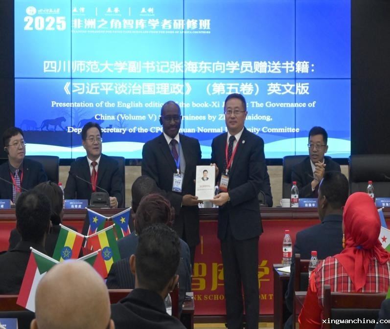 开班仪式上,张海东向学员赠送《习近平谈治国理政》(第五卷)英文版。仪式结束后,全体嘉宾与学员合影留念。