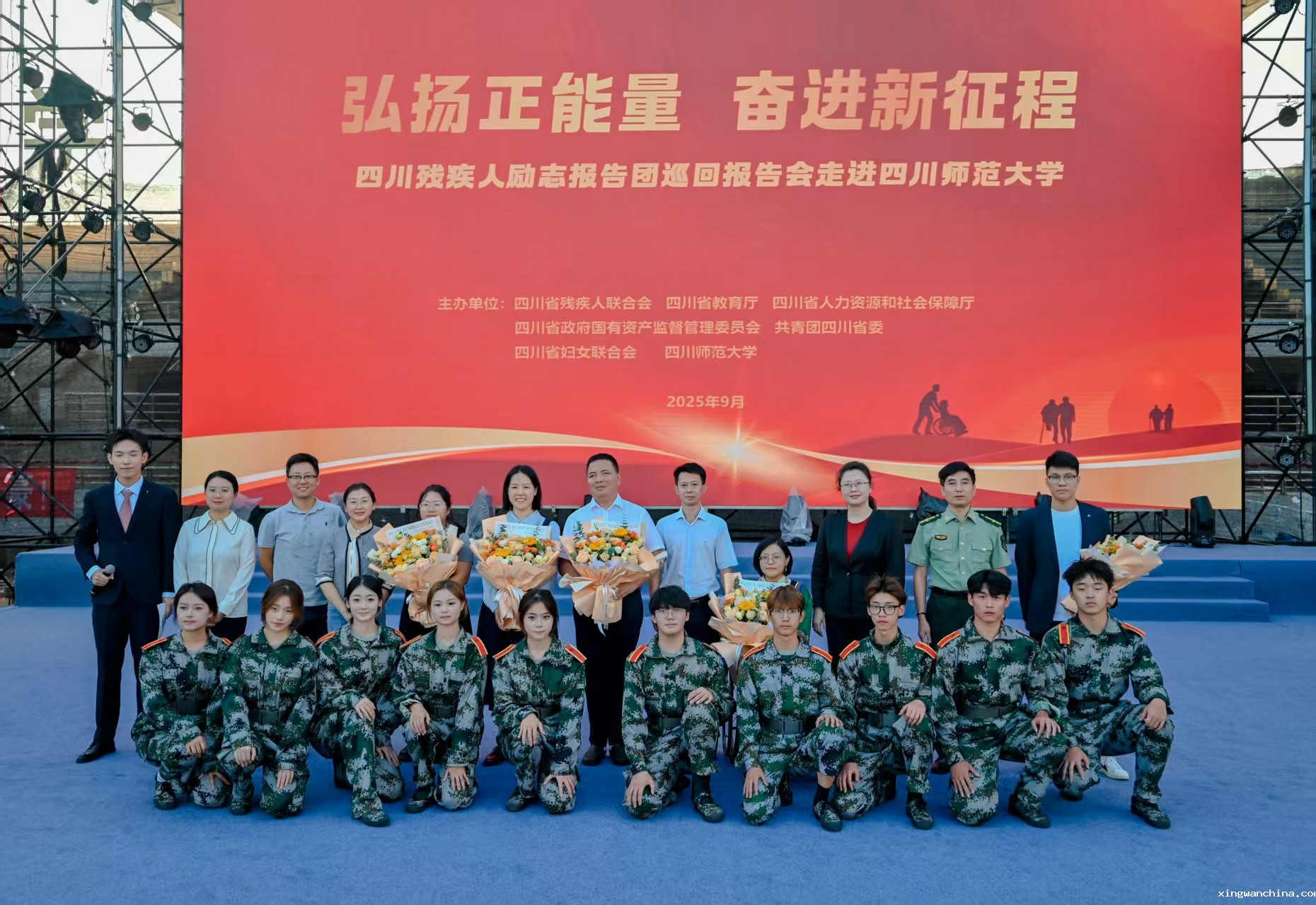 报告会在军训一团学生《擒敌拳》武术展示中拉开帷幕,四川残疾人励志报告团成员李安强、李晓艳、张万印、刘敏分别结合自身经历,讲述了克服身体障碍、坚持奋斗成长、积极回报社会的感人故事。我校大一新生吴丹也向同学们讲述了她面对因残疾带来的巨大生活挑战,不怨天尤人,而是将常人眼中的“不便”转化为需要攻克的“独家秘技”的心路历程,传递出积极向阳、坚韧不拔、心怀感恩并立志回馈社会的人生信念。